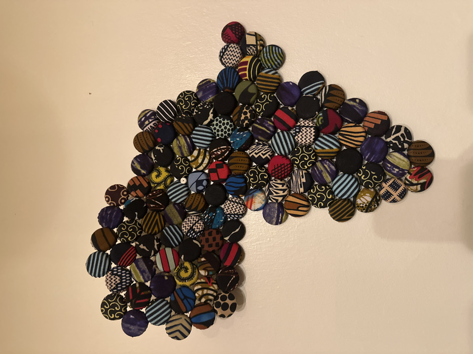 A colorful arrangement of round fabric buttons forms an abstract image resembling a horse's head
