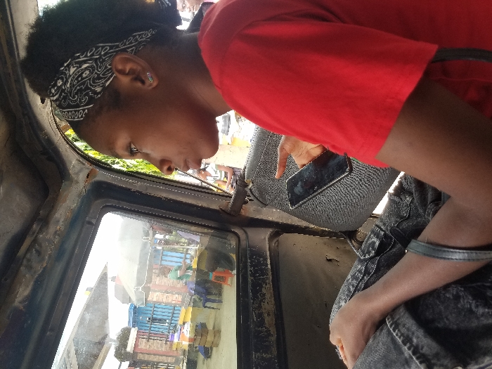A young Black female occupies the passenger compartment of a worn vehicle, facing right and looking out the window