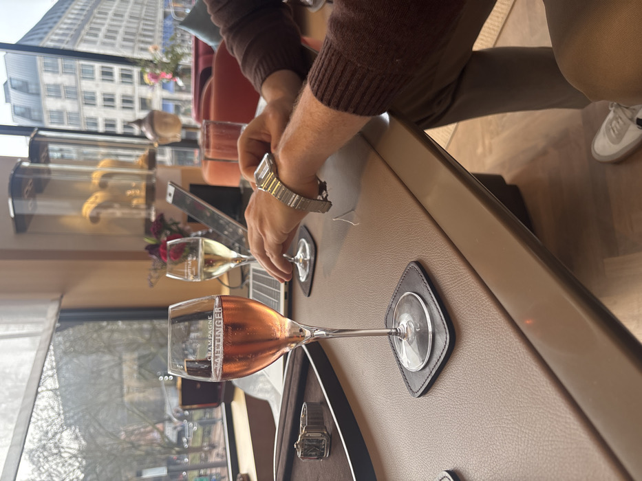 The image depicts the interior of a high-end jewelry or watch boutique, likely located on Königsallee, Dusseldorf, Germany. A person is seated at a large, light brown leather-topped table, with only their forearms and hands visible. They are wearing a brown long-sleeved top and light brown trousers. A silver-toned rectangular wristwatch with an integrated metal bracelet is worn on their left wrist. On the table in the foreground, a flute glass filled with rosé champagne, branded "CHAMPAGNE TAITTINGER REIMS," sits on a dark brown square leather coaster. Behind it, a second flute glass containing white champagne, also on a coaster, is visible. To the left, a silver-toned rectangular watch, consistent with a Cartier Tank model, rests on a dark brown velvet display tray. To the right, an open silver-colored laptop (resembling a MacBook) is positioned, and a clear glass filled with water is present. The background features large windows overlooking a blurred city street with trees and a multi-story building under an overcast sky. Inside the boutique, to the right, two tall glass display cases showcase gold-colored items on stands. A small vase with red flowers is behind the white champagne glass, and a small decorative bust or statue is visible further right. Plush orange and blue armchairs or sofas are also part of the seating arrangement in the background. The floor is light brown wood.