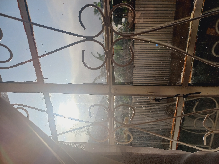This image depicts an outdoor scene viewed through an interior window in Muthambi ward, Kenya. The window features a light-colored frame, divided into multiple panes, and is equipped with decorative, white or off-white metal security bars with scroll-like patterns. The window glass appears dirty or dusty, with visible specks and streaks. A strong sun flare originates from the upper-left pane, partially obscured by a light-colored curtain drawn to the left. A black strap or cord hangs vertically from the central right edge of the left window pane. Beyond the window, a corrugated metal fence runs horizontally across the mid-ground, appearing weathered. Above and behind the fence, green foliage from trees or bushes is visible under a light blue sky with some cloud cover. No individuals are present in the scene.