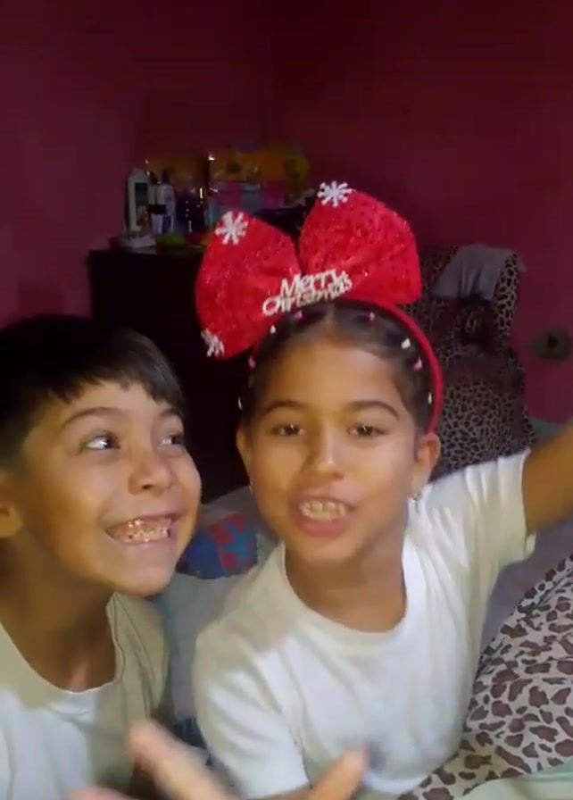 Two children, a boy and a girl, are in a room with pink walls. The girl wears a large red bow with the words "Merry Christmas" on a headband. Both children wear white T-shirts and dark-colored bottoms. The boy is making a silly face, crossing his eyes and grinning widely, revealing some missing teeth. The girl smiles and gestures with her hand. They both yell and collapse onto a bed or futon, wrapping their arms around each other. A wooden dresser with assorted items on top is visible in the background. The bedding has a leopard-print pattern. A bed or futon lies on a tiled floor.