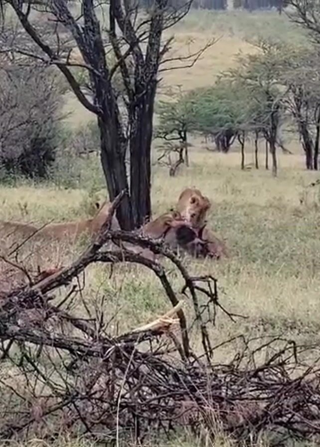 The scene is an open grassy area with sparse trees and fallen branches in the foreground. Three lions are visible, one lying to the left and two clustered in the center, possibly feeding on something. The weather appears overcast or rainy, and the overall tone is naturalistic and documentary-like.
