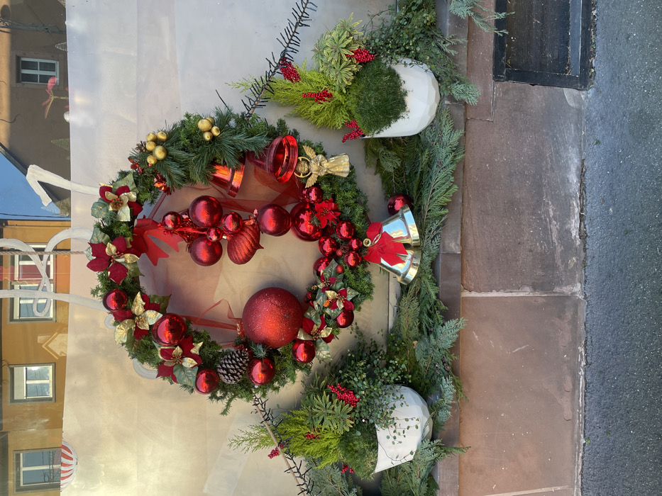 The image depicts an outdoor holiday decoration display located in front of a reflective shop window at street level in Saverne, France