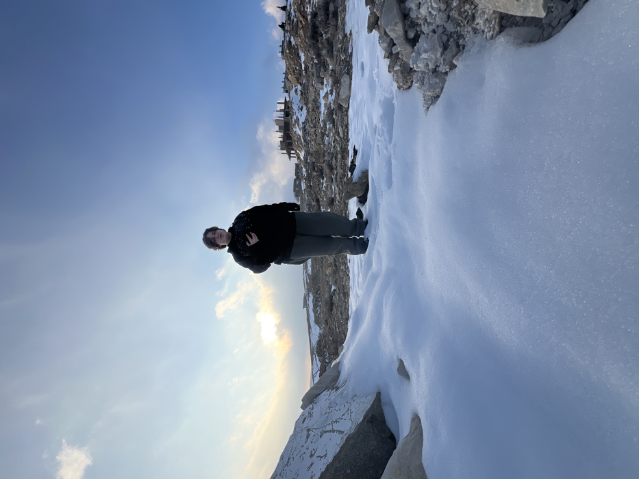 The image displays an outdoor, snow-covered, rocky landscape within the city of Talfita, Syria, under a partly cloudy sky. A single individual, appearing to be a young person or adult with dark, shoulder-length hair, stands centrally in the midground. This individual is dressed in a black hooded sweatshirt featuring a light speckled pattern on the chest, and dark grey trousers. A dark-colored object, consistent with a smartphone, is held in their right hand at chest height. The foreground is primarily covered by a textured layer of white snow, with large, light-colored rocks prominent on both the left and right edges. Beyond the individual, the terrain consists of sparse, rocky ground interspersed with smaller snow patches. In the distant background, to the right and on an elevated section, a multi-level concrete building structure under construction is visible. The sky transitions from a bright, partially obscured sun on the left to a clear blue on the right, populated by scattered white clouds.