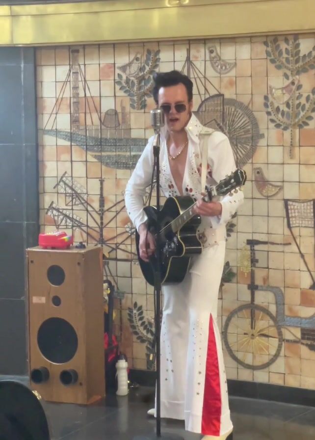 An Elvis impersonator wearing a white jumpsuit with red accents and white boots stands in front of a vintage-style tiled mural, playing an electric guitar and singing into a microphone