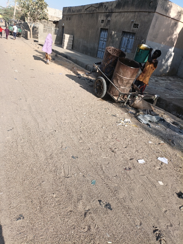 The image depicts a street scene in Gwagwarwa, Nigeria, under bright daylight. In the foreground, an unpaved, sandy road surface occupies most of the frame, showing tire tracks, footprints, and scattered debris including paper scraps and plastic pieces. On the right side, a two-wheeled metal handcart holds two large, rusty metal barrels. A dark-skinned male, wearing an orange long-sleeved shirt and dark shorts, is positioned behind the cart. He is holding a green plastic bucket, containing a dark, viscous liquid, over the top of one of the barrels, appearing to pour or empty its contents into the barrel. Adjacent to the cart and along the edge of the road, a concrete curb separates the road from a dirt and debris-filled gutter area. Behind the handcart, a building with a rough, grey-brown textured facade is visible, featuring multiple closed windows with light blue frames or shutters. A stack of light-colored bricks rests against its wall. In the mid-ground, on the unpaved road, a person wearing a light purple head covering and a patterned skirt walks away from the camera. Further down the road, in the background, several other individuals are walking, one near a motorized tricycle. A tree with sparse foliage is visible in the upper left background, casting shadows on the road.