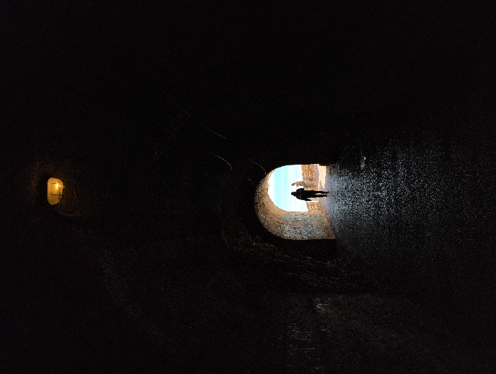 The scene depicts the interior of a dark, arched tunnel leading to a brightly illuminated outdoor area in the city of Unknown, Unknown. The tunnel's rough, dark walls and ceiling are minimally lit by a single, yellow-hued light fixture mounted on the ceiling approximately one-third of the way down from the top of the frame. A single individual, silhouetted in dark clothing, walks away from the camera, positioned centrally within the tunnel, towards the arched exit. Beyond the tunnel exit, a second, less defined, silhouetted person is visible standing near a light-colored structure, possibly a wall or railing, under a clear, bright sky. The tunnel's ground surface is a dark, granular path, reflecting some light from the exit.