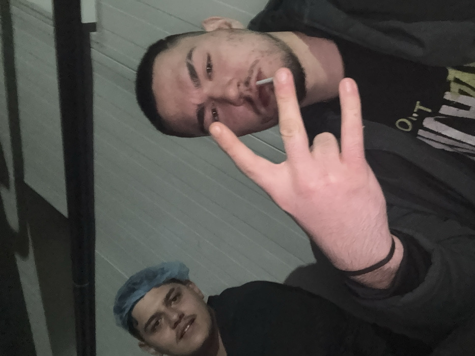 The image captures two young adult males in Yambol, Bulgaria, positioned in a selfie-style shot against a dimly lit background composed of light grey, horizontally paneled walls. A dark horizontal structure is visible in the upper background. The individual in the foreground, on the right, has short dark hair and noticeable facial stubble. He wears a dark hooded jacket over a black t-shirt featuring partially visible light-colored graphic text. His right hand is raised, forming a gesture with the index and pinky fingers extended, while the thumb secures the middle and ring fingers. A thin, dark band or bracelet is on his left wrist. A white, cylindrical object is held in his mouth, protruding slightly. He looks directly at the camera with a neutral expression. The second individual, positioned in the left background, wears a light blue disposable hairnet on his head and a dark long-sleeved garment. He has a visible light mustache and gazes towards the camera with a slight smirk.