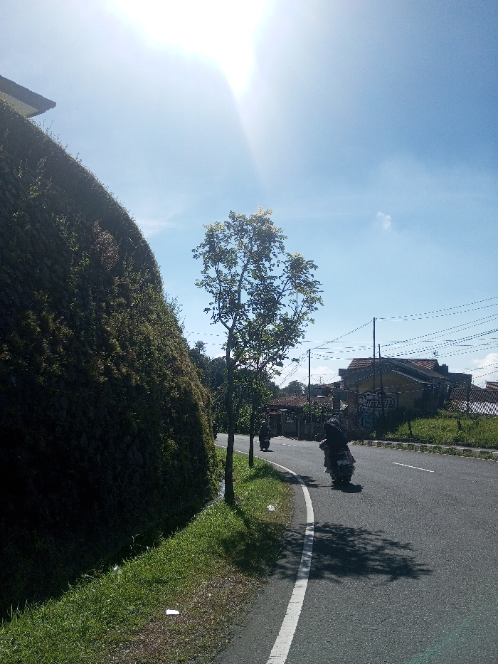 The scene depicts a sunny day along a paved road in Ka Thaung (Upper), Myanmar. The bright sun, positioned in the upper left, causes a significant lens flare across the upper portion of the frame, illuminating a clear blue sky with a small white cloud visible in the upper right. On the left, a steep, high retaining wall or embankment, densely covered in green vegetation, runs parallel to the road. A narrow strip of green grass separates this wall from the asphalt road. Scattered white litter is visible on this grass verge. The road itself is asphalt, featuring a solid white line along its right edge, delineating the shoulder or a lane boundary. It curves gently to the right as it recedes into the mid-ground. Two individuals on scooters are visible on the road, traveling away from the viewer. The nearest scooter, dark-colored, carries a person dressed in dark clothing with a dark head covering, positioned on the right side of the road. Further down the road, a second, dark-colored scooter with a rider is partially obscured by the foreground scooter and a tree. Several slender trees with green foliage line the road, with one prominent tree in the mid-ground casting a distinct shadow onto the asphalt. In the background, to the right of the road, several buildings with reddish-brown tiled roofs are visible. One building displays yellow/ochre-colored walls with dark graffiti. Utility poles with multiple overhead power lines are visible above these buildings and running along the road. Distant hills covered in greenery are faintly discernible beyond the buildings.