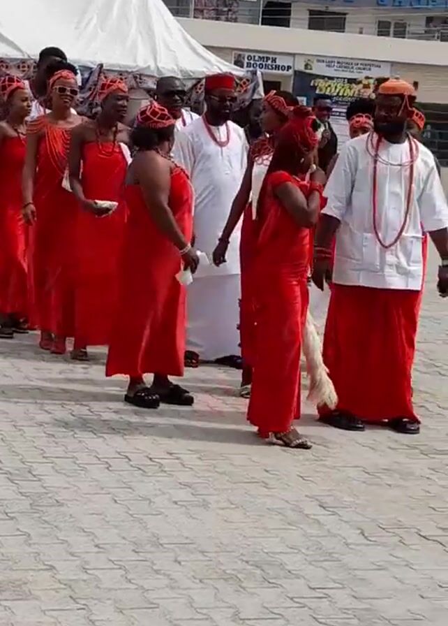 A group of approximately twelve people wearing traditional attire walk in a line on a paved surface. The women are mostly wearing red dresses, beaded necklaces, and headwear, while the men are wearing white shirts and red pants or wraps, also with beaded necklaces and headwear. One woman holds a white feathered fan. They appear to be part of a ceremony or celebration. In the background, there is a large white tent and a multi-story building labeled "YAD Prime Shoppe" and "OLYMPH BOOKSHOP". The sky is visible in the background. The atmosphere seems festive and cultural.