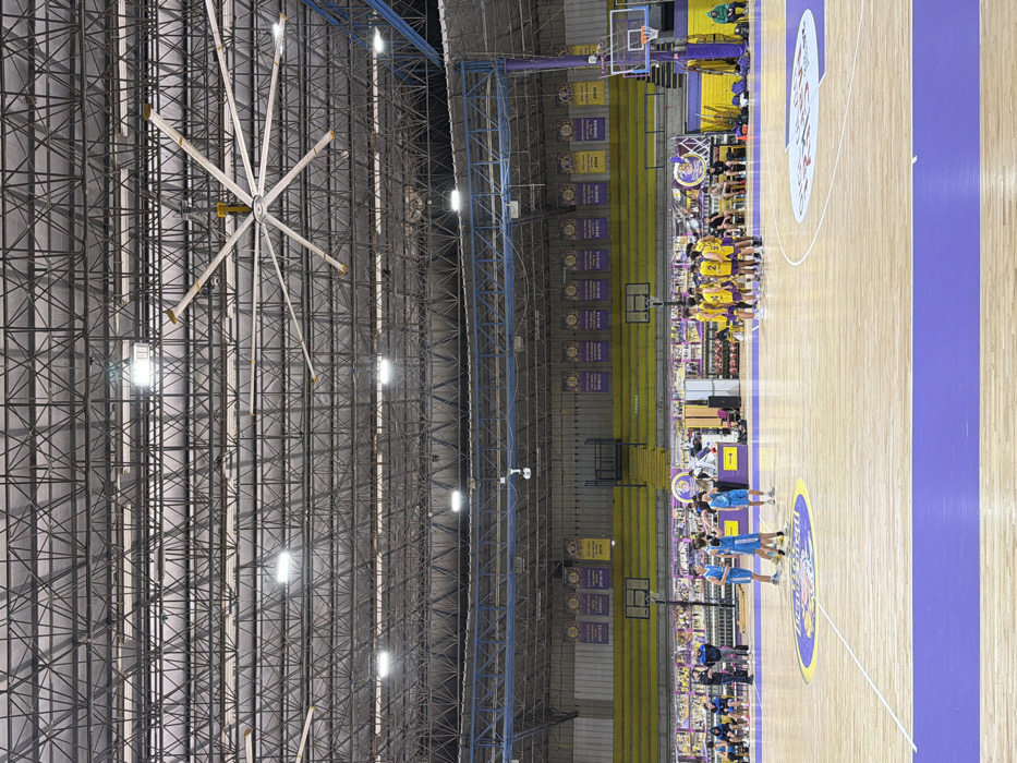 A basketball court features two teams in yellow and blue uniforms. Players are near mid-court, possibly during a game or practice. The court has purple accents, including boundary lines and center court logos. Banners hang along the sidelines above the seating. The arena's ceiling has a large, slow-turning fan. Structural steel supports the roof and lighting fixtures are visible.