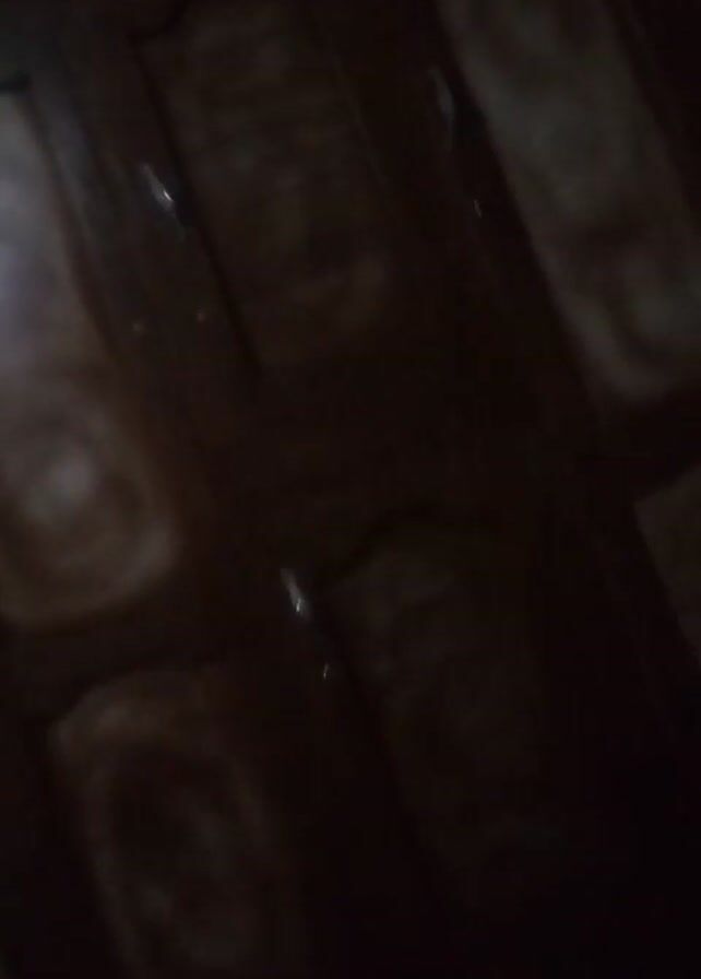 dark brown wooden door with six panels. The lighting is dim, and the camera angle is slightly tilted. There is a small metallic latch visible on the door. The video is blurry and shaky.