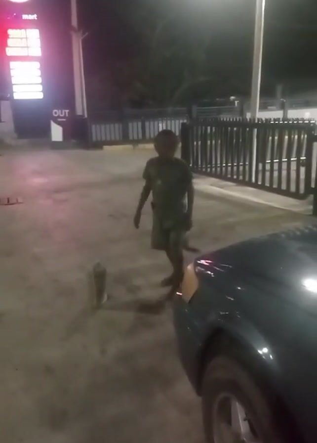 young boy standing in a gas station parking lot at night