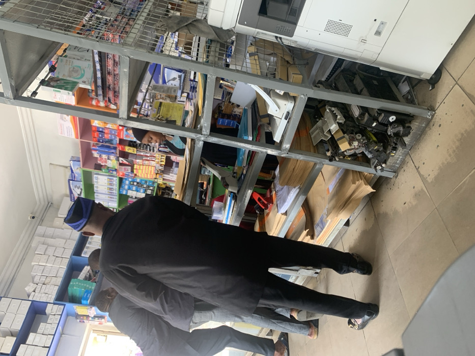 The image displays an indoor scene within a commercial establishment, identified as a stationery and printing shop, located in Abuja, Nigeria
