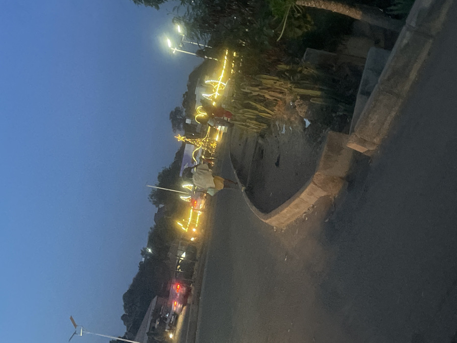 An outdoor evening scene showcases a winding road lined with streetlights. On one side, a Christmas-themed display, featuring illuminated reindeer and Christmas trees, catches the eye. A person walks along the road, adding to the ambiance. The right side of the frame is defined by a concrete curb, transitioning to a landscaped area with plants and steps. The sky is a gradient of blue, suggesting either dusk or dawn. A lone windmill stands in the lower left, seemingly out of place amidst the seasonal decor.