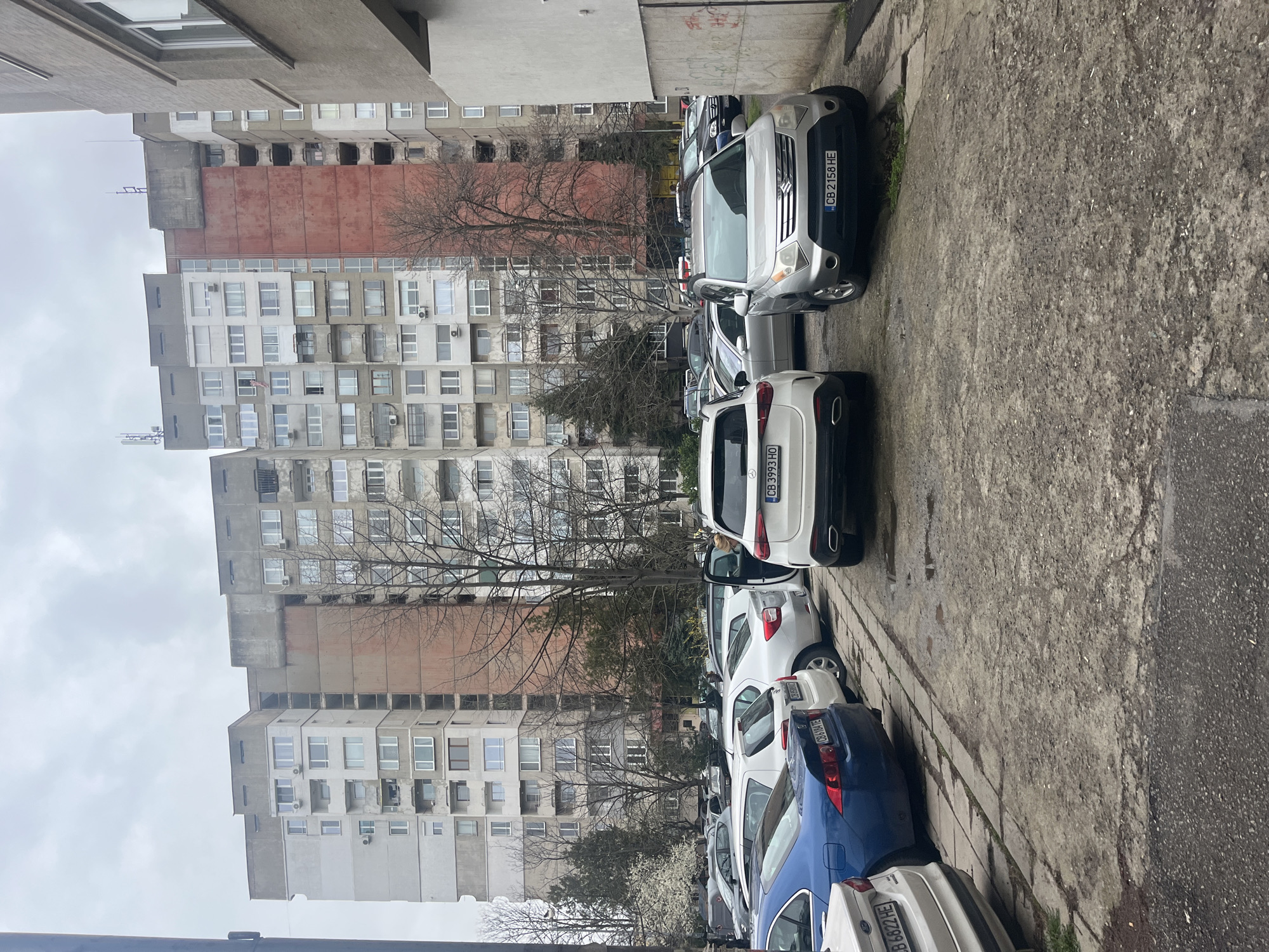 narrow alleyway in an urban area, likely a residential neighborhood. Multiple cars are parked closely together along the right side of the alley. The cars are a mix of colors, including blue, white, and silver. On the left side of the alleyway is a tall, Soviet-era apartment building. The building is gray and concrete, with rows of windows and balconies. There is a tree in front of the building. The sky is overcast. Given the license plates on the cars, which are Bulgarian, and the style of architecture, the location is likely Sofia, Bulgaria. There are no people visible in the image. The scene appears to be a typical residential street in a densely populated area.