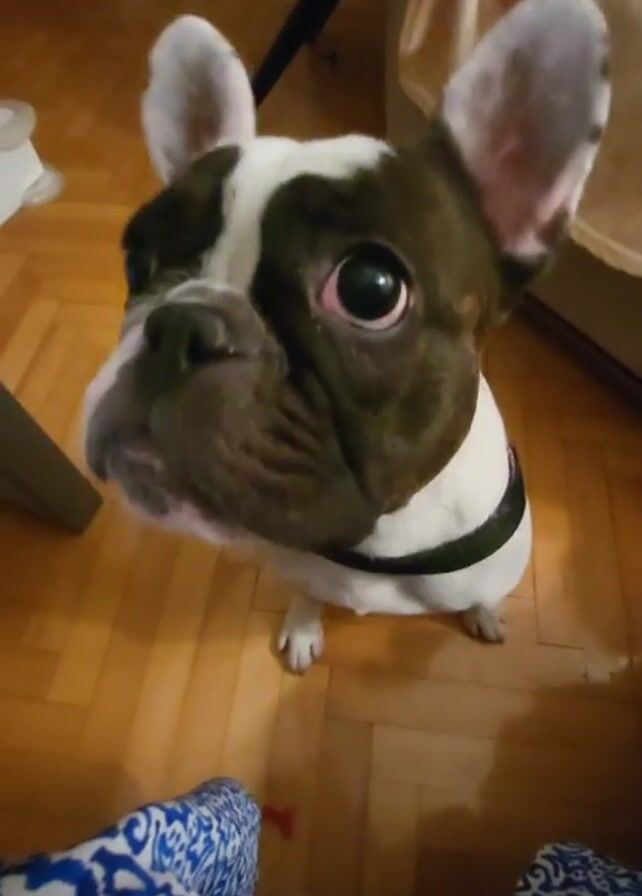The video begins with a close-up shot of a French Bulldog sitting on a wooden floor, looking up at the camera