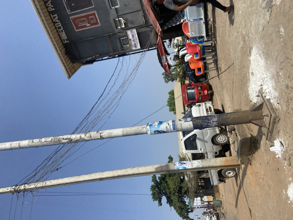 The scene depicts an outdoor commercial thoroughfare in Sardauna, Nigeria, under a clear, bright blue sky. Two prominent utility poles, one concrete and one metallic, stand centrally. Numerous black electrical wires are haphazardly strung between them and extend across the frame. The metallic pole exhibits peeling paint and two torn political campaign posters featuring a male subject, with visible text including "MAULUDU". The ground is primarily reddish-brown dirt and gravel, with concrete bases supporting the poles; white debris is scattered near the base of the metallic pole. A white compact pickup truck is parked facing left between the utility poles. Further right and behind it, a red three-wheeled vehicle (tricycle) is stationary. On the far right, a partial view of a person, from the torso downwards, wearing a dark t-shirt and dark trousers, walks from right to left. To the right, a dark gray two-story building is visible, featuring signage for "FINECOAT PAINT" at its upper level and "EVANS EYE CARE LTD" below. Two decorative doors, one red and one brown, are mounted on the building's facade. An outdoor retail display, partially shaded by an awning, is set up in front of the building, showcasing multiple new plastic chairs in various colors (orange, red, blue, green) and several transparent plastic water dispensers or containers. In the distant left background, a street sign partially reads "Abuja Road", and a green and white flag is visible on a pole amidst scattered vegetation and other structures.