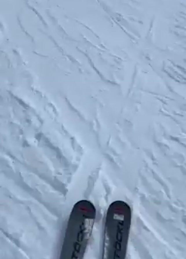 first-person perspective of someone skiing down a snowy slope on a sunny day