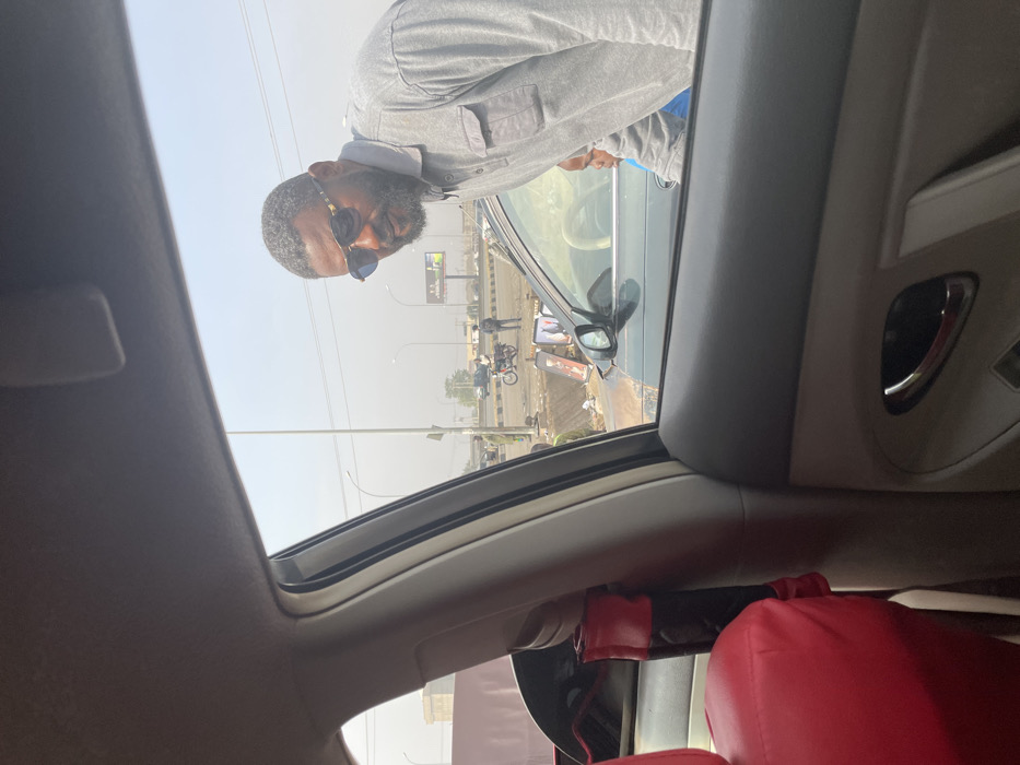This image depicts a street scene in Kagini, Nigeria, viewed from the interior of a vehicle through the front passenger window. In the midground, a dark-skinned male subject with a beard and dark-framed sunglasses, wearing a light grey long-sleeved collared shirt, leans towards the camera's vehicle. His upper torso is visible as he observes the interior of the vehicle from outside. Adjacent to the man and parallel to the camera's vehicle is a dark-colored sedan, with a child's head partially visible near its passenger side. The foreground shows the camera vehicle's interior components: a red car seat cover on the left, a beige A-pillar, and a portion of the inner door panel with a chrome handle. The background reveals a multi-lane urban road with apparently stationary or slow-moving traffic. Several pedestrians are visible on or near the road, including one person standing near a white pole on the left and two others near a red and black motorcycle stopped on a median. The median strip contains various items, including upright rectangular objects. Overhead power lines cross a hazy, pale blue sky, and a large billboard is discernible in the distant right background.