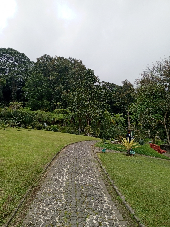 A stone path winds through a verdant landscape. Lush green grass lines the walkway, leading towards a dense forest. Various ferns and trees flourish on the slopes, under a cloudy sky. A person stands near a yellow, spiky plant, adding a touch of human presence to the natural scenery. A red bench sits nearby, inviting relaxation amidst the greenery.