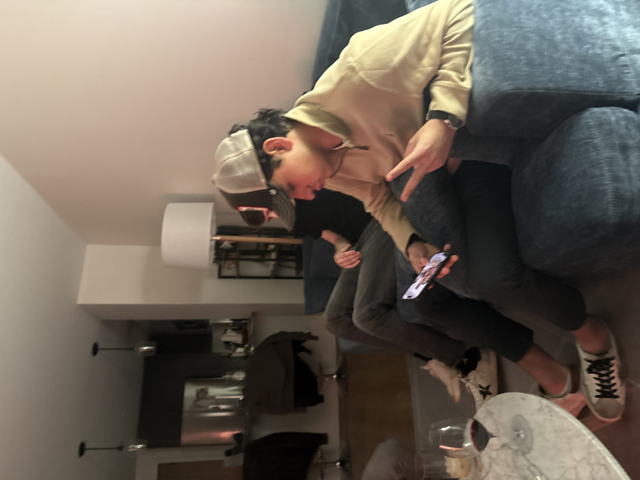 Two individuals are captured in an indoor setting. One is perched on the edge of a blue couch, giving a peace sign, wearing a tan zip-up hoodie and a trucker hat, while engrossed in a phone. The second person, clad in dark attire, sits beside them. A table with a glass of wine is situated in the foreground. The background includes a kitchen area with a lamp and shelves.