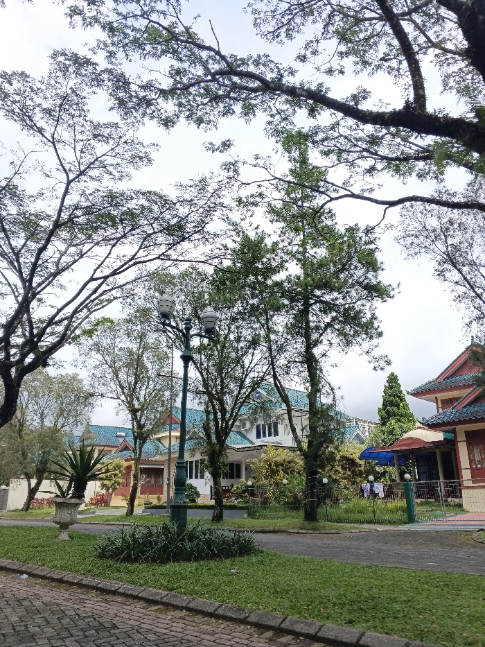 A street scene framed by trees reveals several buildings with unique architecture. Most have a distinctive teal-colored roof. The building on the right has a red facade with Asian-inspired roof details. A grassy area with a stone-paved path leads toward these buildings. A vintage-style streetlamp stands amidst the trees and foliage, providing lighting along the walkway. The sky is overcast.