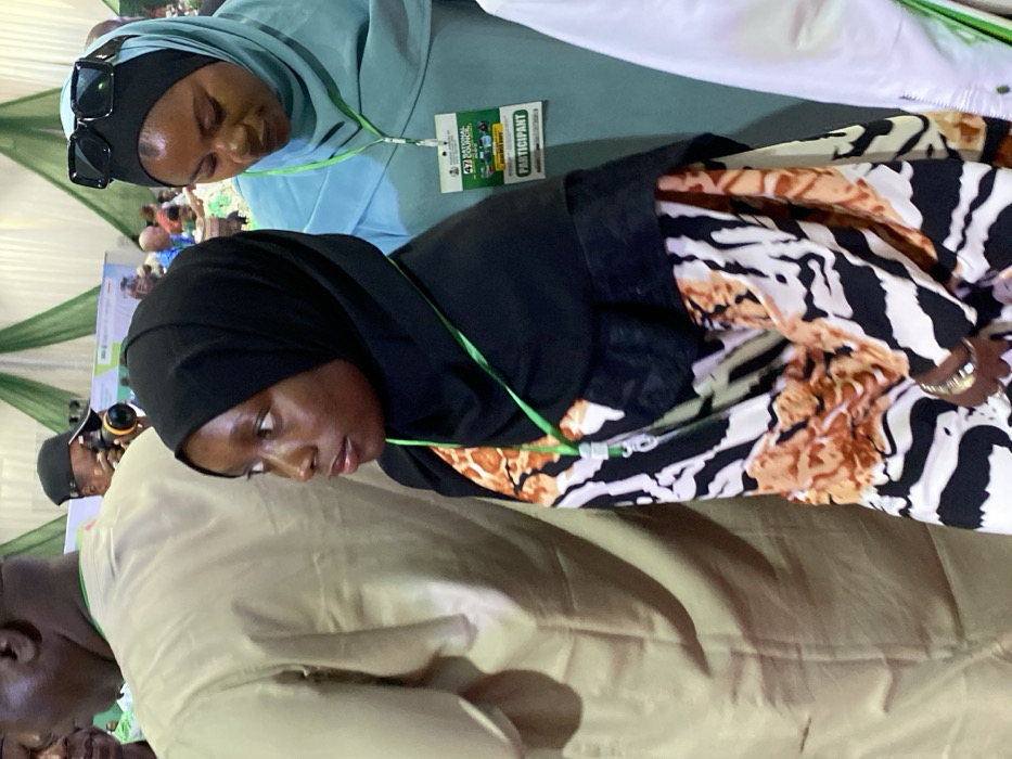 An indoor scene in Unguwar Sarki, Nigeria, depicts a crowded event, likely a conference or council meeting. In the foreground, a young female individual with dark skin is visible from the chest up, positioned slightly left of center. She wears a black hijab and a long-sleeved garment featuring an abstract pattern in black, white, and orange/brown. A green lanyard with a white clip is draped around her neck, and a light-colored bracelet is on her left wrist. Her head is turned slightly to the right, and her gaze is directed horizontally to the right. To her immediate right, a second female individual with dark skin is partially visible. She wears a light blue hijab, with black sunglasses perched on top, and a light blue top. A green lanyard with an identification badge reading "47th NATIONAL COUNCIL" and "PARTICIPANT" hangs around her neck. She is looking downwards. To the left of the central figure, the back and partial head of a person wearing a light tan or khaki long-sleeved garment are visible. In the blurred background, numerous individuals are present, some appearing to be seated. Draped green and white fabrics form a backdrop, and a person holding a professional camera with a large lens is visible behind the foreground figures.