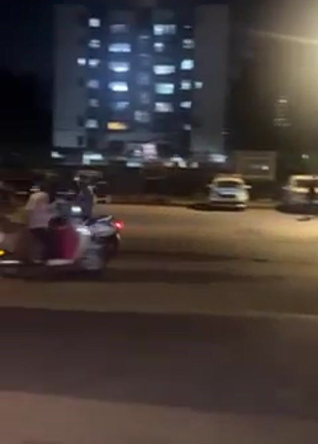At night, a scooter with two people onboard drives past a parked delivery truck in a city. The scooter approaches a crossroad with parked auto rickshaws and trucks. The scooter turns and proceeds in another direction.