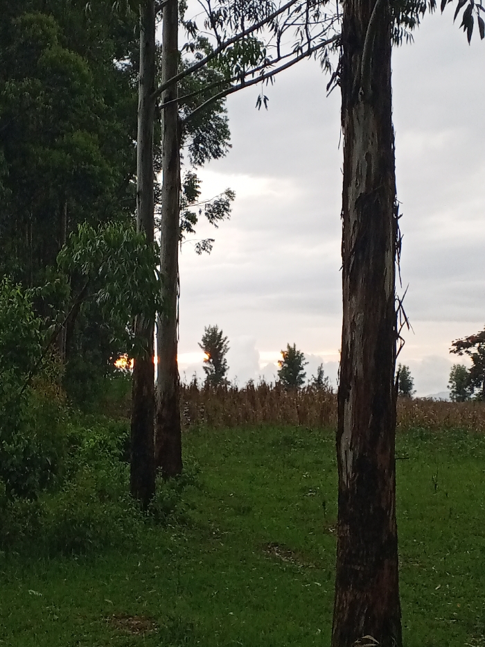 The scene, located in Keyian ward, Kenya, captures a rural outdoor environment under a diffused, cloudy sky illuminated by a low sun, indicative of either sunrise or sunset. The immediate foreground features a dense expanse of green grass and low-lying vegetation. Two prominent, slender eucalyptus trees stand vertically, with the tree on the right exhibiting distinct peeling bark. A third, thinner tree is positioned between them. Directly behind the grassy foreground, a field of mature, dry maize stalks, characterized by their brown coloration, spans the midground. Scattered green-foliage trees are visible within and beyond this field. The horizon presents localized areas of intense orange-yellow light from the low sun. A dense, dark green forest line occupies the far left background. No individuals, animals, or artificial structures are discernible within the frame.