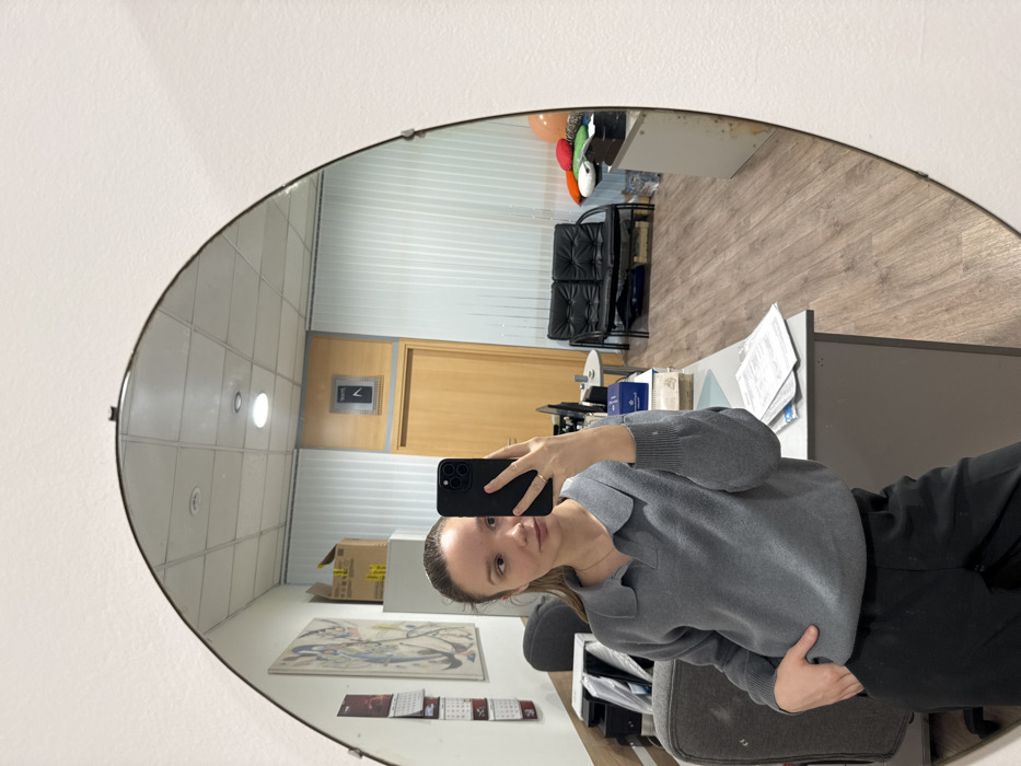 An indoor selfie depicts a young adult female, reflected in an oval mirror affixed to a white wall. The subject has light skin, pulled-back brown hair, and wears a grey long-sleeved polo shirt and dark pants, with her left hand in her pocket. She holds a dark-colored smartphone with a prominent camera array in her right hand, angled to capture her reflection. The scene is an interior office space located within Krasnoyarsk, Russia. The reflected environment details an office. To the left, a grey office chair is partially visible near a light-colored desk holding various documents and a blue box. Behind the desk, against a light-colored wall, are a dark printer, stacked cardboard boxes, a wall calendar, and a framed abstract artwork. To the right, a black two-seater sofa with a metal frame is positioned in front of a white wall featuring vertical blinds. Colorful objects, resembling deflated balloons, are stacked behind the sofa. A light-colored wooden door, topped by a framed square object (possibly a control panel or sign), is visible in the background. The floor is light brown wood laminate, and the ceiling consists of white acoustic tiles with integrated recessed lighting. The specific street address within Krasnoyarsk is not ascertainable from the image.