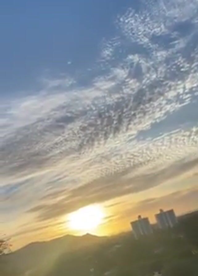 landscape scene with a sunset. The sun is visible behind a mountain range, casting a golden glow on the sky and clouds. The clouds are textured and streaky, with a mix of white, blue, and yellow hues. In the foreground, there are some buildings silhouetted against the bright light.