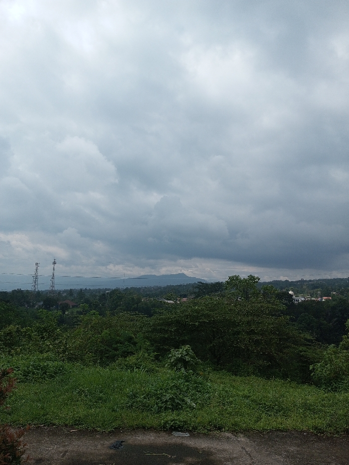 Overcast sky fills the frame, casting a muted light over a landscape. Two tall telecommunication towers stand on the left horizon. A dense forest of green foliage stretches across the mid-ground, partially obscuring a town with distant buildings. In the background, a mountain range is visible through the haze. The foreground has greenery with a hint of concrete.