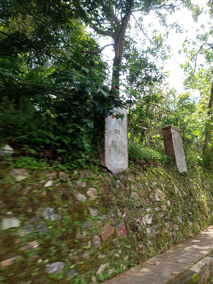 The scene depicts a roadside in Viengthong, Laos, captured from a moving perspective. A paved path, composed of reddish-brown rectangular pavers, extends along the lower right portion of the image. To its immediate left, a retaining wall constructed from irregular stones is visible, heavily overgrown with green moss and small plants. Positioned on the elevated ground above this wall are two weathered, rectangular concrete or stone pillars. The pillar on the left is light grey, mostly upright, and exhibits a small red mark on its upper left surface. The second pillar, located to the right and further back, is darker, similarly shaped, and leans slightly to the right. Dense green foliage, including trees with visible trunks and branches, dominates the background and upper left, with a bright sky visible through the canopy. No individuals, animals, or specific actions are discernible within the frame.