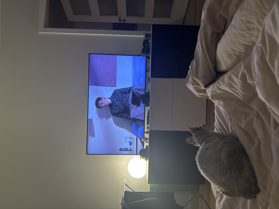 A room scene features a television mounted on a black and white dresser. On the screen is a man in a gray suit, sitting on a bed against a light blue backdrop. A round lamp stands near the dresser's base. In the foreground, a gray cat sits on a wrinkled, beige-toned bed, its attention directed toward the television. A partially visible white door is in the background.
