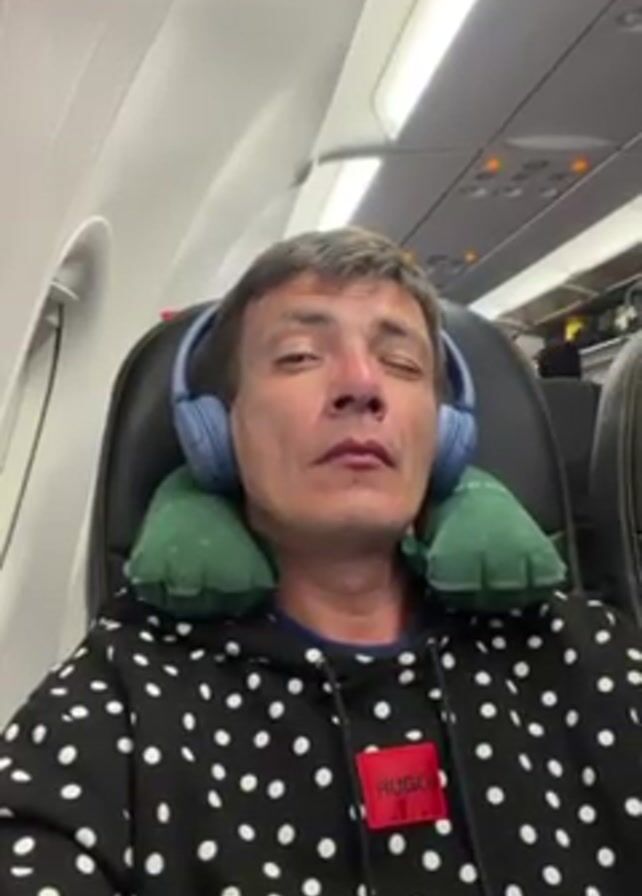 man seated on an airplane. He is wearing a black and white polka dot hoodie with a red Hugo patch on the chest, blue headphones, and a green inflatable neck pillow. His eyes are closed, and he appears to be resting or sleeping. The airplane cabin is visible in the background, with the window, seats, and overhead compartments. The overall lighting is fairly dim.