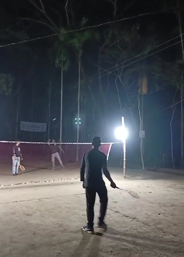 Three men play badminton on a dirt court under bright lights at night. The court is defined by a net, and the players are using rackets to hit a shuttlecock back and forth. Palm trees and other trees surround the court. Power lines are visible overhead.