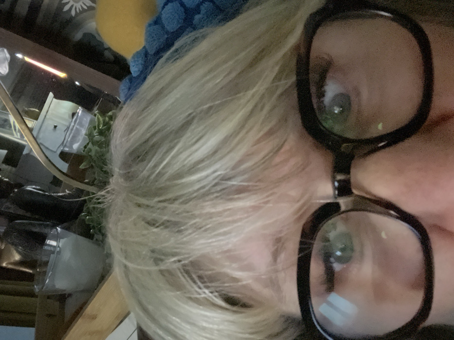 The image features a close-up of a person's face, primarily focusing on the eye area. The individual has fair skin, light blonde hair, and is wearing black-framed eyeglasses. The lens of the glasses slightly obscures the eyes, which appear to be green. In the background, a dimly lit shelf displays several items, including a potted plant, glass containers, and what seems to be a wooden frame. The perspective is slightly tilted, giving the image a dynamic feel.