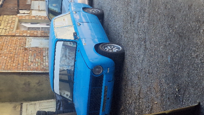 A light blue, possibly teal, Lada sedan, likely a 2101 or 2105 model, is parked on a gravel and dirt surface