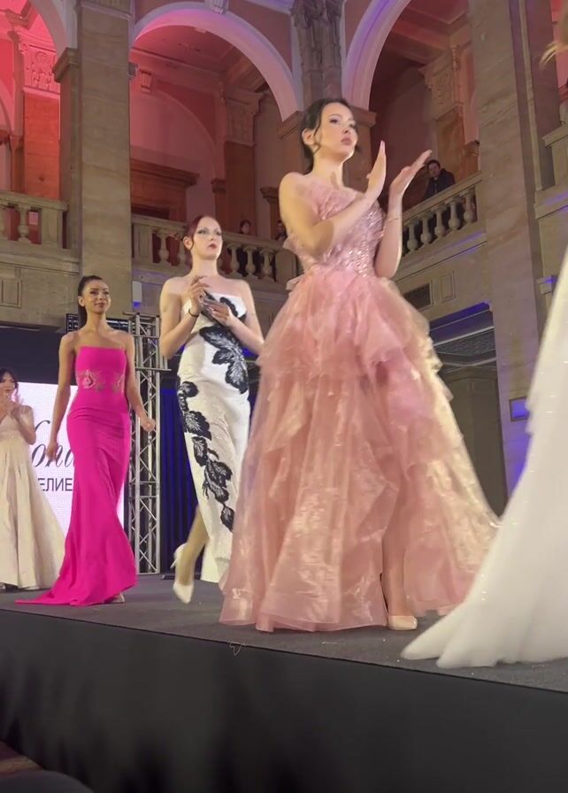 The video captures a fashion show in a grand hall with high ceilings and archways. Several female models are walking down a raised black runway, each wearing a different elegant gown. From the viewer's left, the first model is wearing a beige gown, the next a bright pink form-fitting gown, then a white gown with black floral detailing, followed by a ruffled pink gown, and finally a layered white gown. All the models are clapping in appreciation. An audience watches from the sides and a second-story balcony. The lighting is varied with pink and blue hues illuminating the hall.