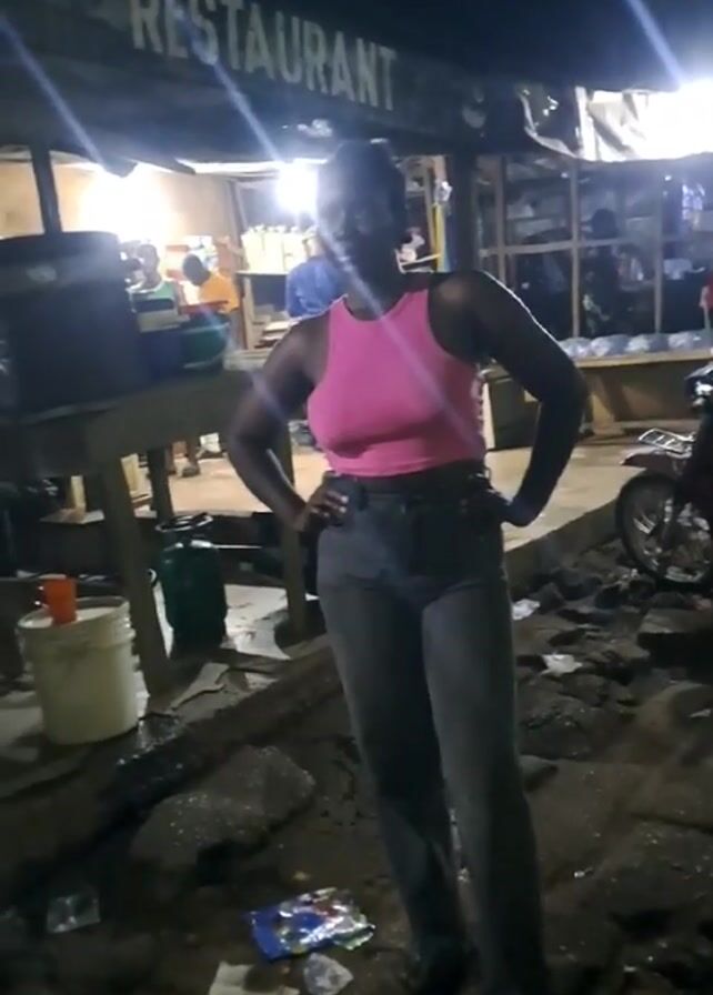 woman standing in front of a restaurant at night, then a man walking by, smiling and looking back. The woman is wearing a pink tank top and dark gray jeans. She has her hands on her hips. The restaurant has a sign that says "RESTAURANT" above the entrance. There are people inside the restaurant. There is a moped parked to the right of the woman. The ground is covered in debris. The man is wearing a white and black patterned shirt. There are other people walking around in the background.