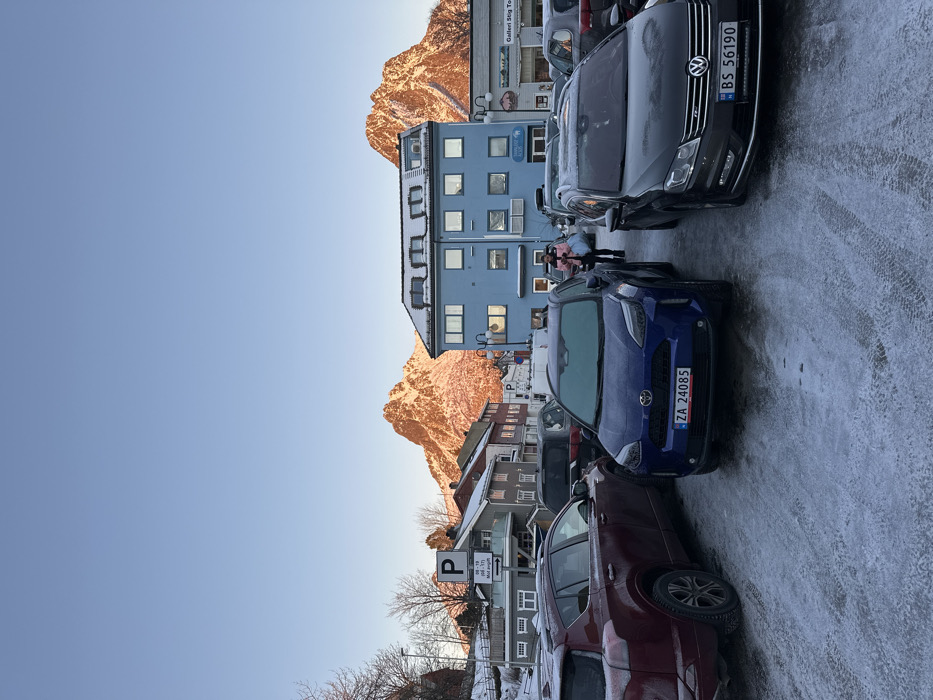 The scene depicts a winter day in Svolvær, Norway, characterized by snow and ice covering the ground. In the foreground, a parking lot is occupied by several vehicles, with tire tracks visible in the snow. A dark blue Toyota Yaris Cross, bearing Norwegian license plate ZA 24085, is parked prominently slightly left of center. To its right is a dark gray Volkswagen Passat with Norwegian license plate BS 56190. A dark red SUV is partially visible to the left of the Toyota. A single individual, dressed in a light-colored jacket and dark pants, walks between the blue Toyota and the dark gray Volkswagen, carrying a light-colored bag or package. In the midground, behind the parked cars, several buildings line a street. A multi-story, light blue building with a snow-dusted flat roof stands in the center-right, featuring multiple windows and an illuminated sign for a "Tannlege" (dentist). To the left, various other buildings, some with pitched, snow-covered roofs, are visible, interspersed with bare deciduous trees. A white parking sign indicating "P" for parking and hours "09-19" ("Mot avgift" - subject to charge) is positioned on the left side of the parking lot. The background is dominated by rugged, snow-dusted mountains, their peaks illuminated with a warm, golden light from a low-angle sun, suggesting either early morning or late afternoon. The sky above is clear and pale blue. The overall environment suggests a cold, clear winter day.