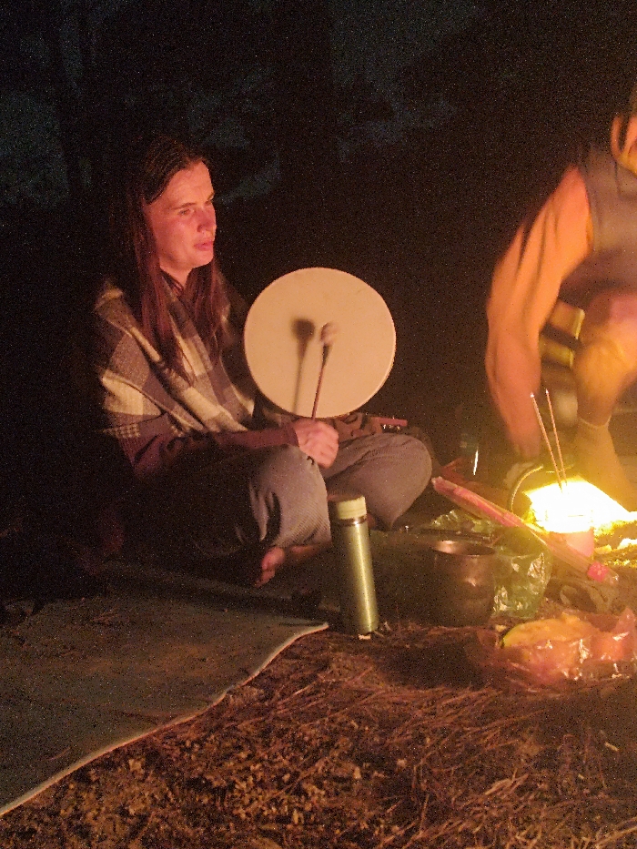 The scene depicts a nighttime outdoor gathering in Lạc Dương, Vietnam. A person with long, dark hair, wearing a plaid shawl over a dark shirt and light pants, sits cross-legged on a mat in the left foreground. They hold a light-colored, circular hand drum with two drumsticks resting on its surface. Their bare feet are visible on the mat. To their right, a green cylindrical thermos stands upright. Further to the right, a second, partially obscured individual is visible near a glowing fire, which provides the primary illumination for the scene. Adjacent to the fire are a dark bowl or pot, several red stick-like objects (likely incense) placed upright, and a yellow-orange item wrapped in clear plastic. The ground consists of dirt and scattered dry foliage.