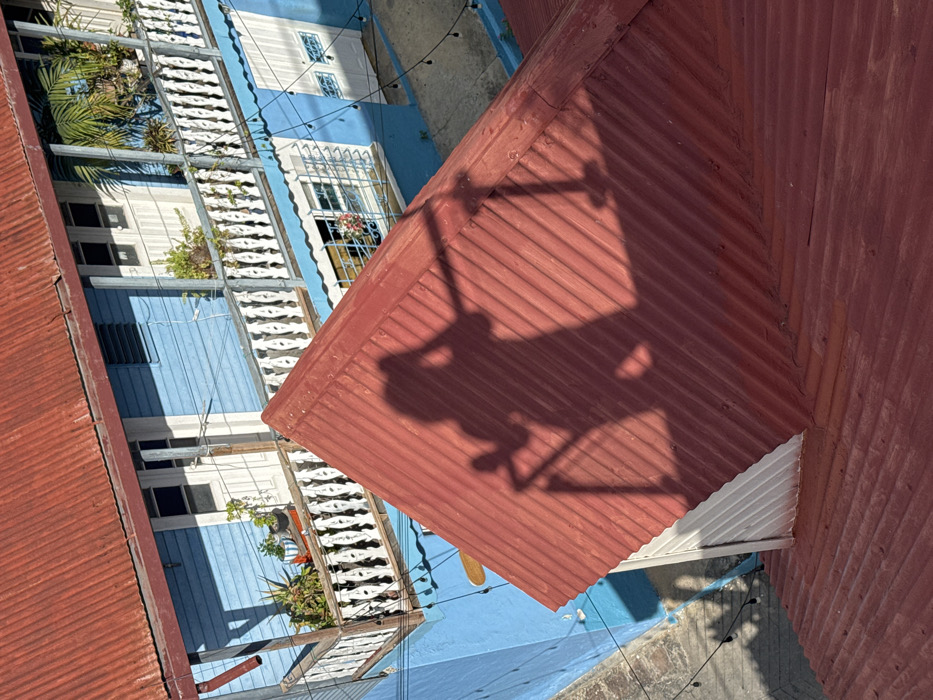 An elevated view reveals a building with blue and white walls, ornate white balconies, and windows with decorative grilles. Lush greenery adorns the balconies. Adjacent buildings are topped with red corrugated metal roofs. A distinct shadow, possibly cast by a chair or similar object, is projected onto the red roof. The scene is brightly lit.