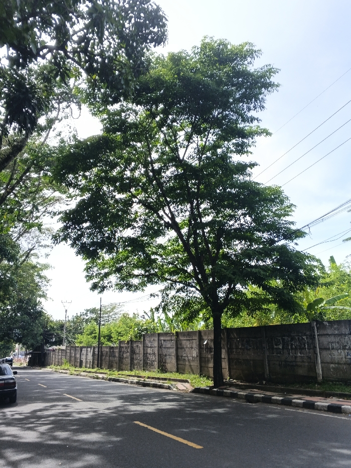 An asphalt road stretches towards the horizon, marked by a yellow line. Shadows dapple the road surface, cast by the foliage of trees lining the street. A concrete wall runs parallel to the road, acting as a barrier behind which green vegetation thrives. A tall tree stands between the road and the wall. Power lines crisscross the sky in the background. A portion of a car is visible on the left side of the frame.