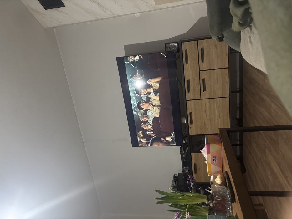The image depicts an indoor domestic setting, identified as a living room in Topolovo, Bulgaria. A large, flat-screen television is centrally positioned, displaying a movie or television program scene set within a cinema. The screen shows multiple individuals seated in rows of dark red theater seats. Prominently featured are a young male and female, seated together, with the male wearing a light-colored shirt and tie, and the female in a light-colored, possibly lace-detailed top. A strong light flare is visible on the television screen, specifically over the female subject's face. The television rests on a modern media console, constructed from light wood-effect panels with dark metal framing and handles, featuring multiple drawers and cabinet doors. To the left of the TV, on the console, a dark electronic device is visible. To the right, a small, dark framed object is present. In the foreground, on the left, a wooden coffee table with dark metal legs holds various items: two potted plants with tall green leaves, one appearing to be a hyacinth with purple blossoms in a clear glass pot; a rectangular box of "Floralis" brand tissues; a small, light-colored rock or decorative stone; and a dark remote control. The room features light-colored walls, with the ceiling also being light-colored. A strong light source is evident in the upper left of the frame, casting a bright flare. The flooring consists of light-colored wood planks. A section of a light grey sofa or couch, partially covered by a darker grey blanket or throw, is visible in the lower right portion of the image. The wall on the right exhibits a textured, light beige finish, possibly decorative plasterwork, with a dark rectangular vent or fixture mounted high on the wall.