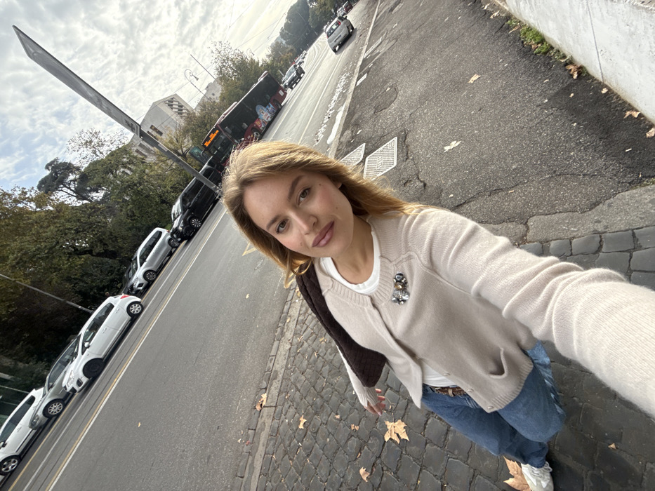 A young adult female stands on a cobblestone sidewalk in Rome, Italy, captured in a selfie-style photograph