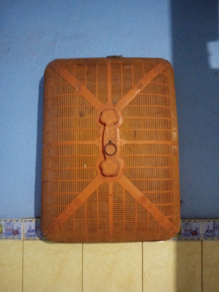 This image, taken in Ciherang, Indonesia, presents an indoor scene featuring a prominent orange plastic food cover or basket lid positioned against a light blue wall