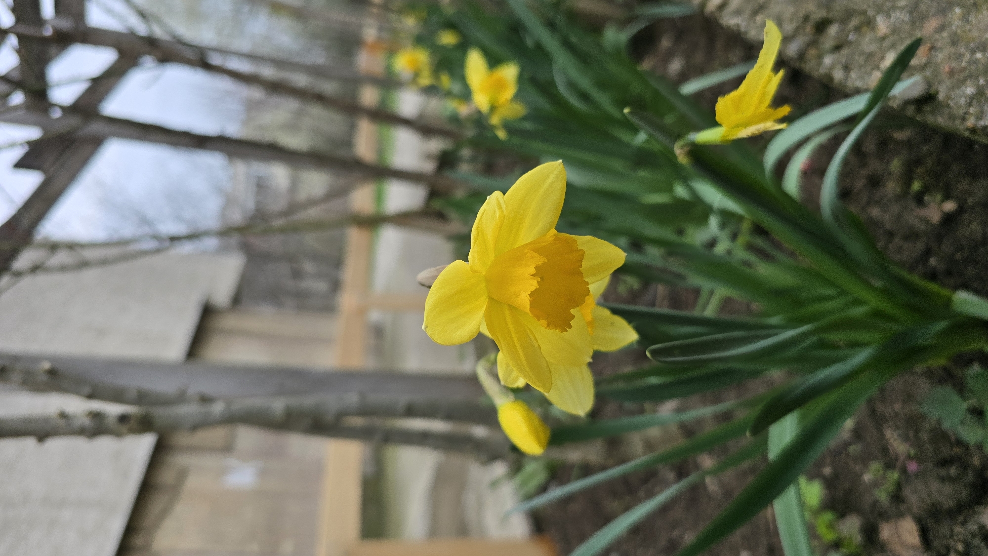 The image features a close-up shot of yellow daffodils in bloom. The flowers are the focal point of the image, with several blossoms visible, including one prominently in the foreground. Green leaves surround the flowers, contrasting with the bright yellow petals. In the background, there's a fence-like structure and some vegetation. The lighting suggests it is daytime. I cannot ascertain the specific location in Pleven, Bulgaria.
