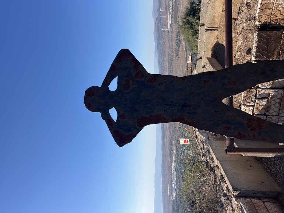 A rusted, dark brown metal silhouette sculpture of a human figure stands in the foreground, viewed from the rear, with its arms raised and hands positioned behind its head, against a clear blue sky